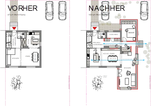 Bei der Planung des Anbaus wird auch eine Neuordnung der Räume im Bestandshaus berücksichtigt, so dass durch wenige bauliche Eingriffe eine Aufwertung aller Nutzungsbereiche erreicht wird.