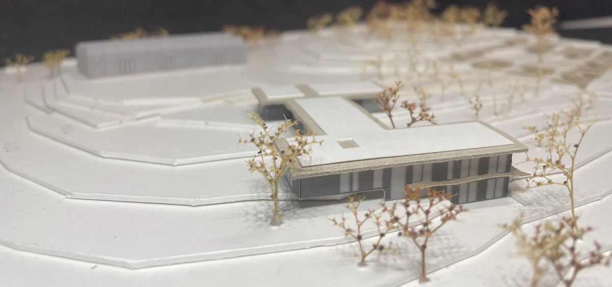 Haupt- und Nebengebäude sind eingeschossig und mit einem intensiv begrünten Flachdach versehen. Auf diese Weise tritt der Baukörper kaum aus der umgebenden Landschaft heraus, vielmehr fügt er sich in das Gelände ein.