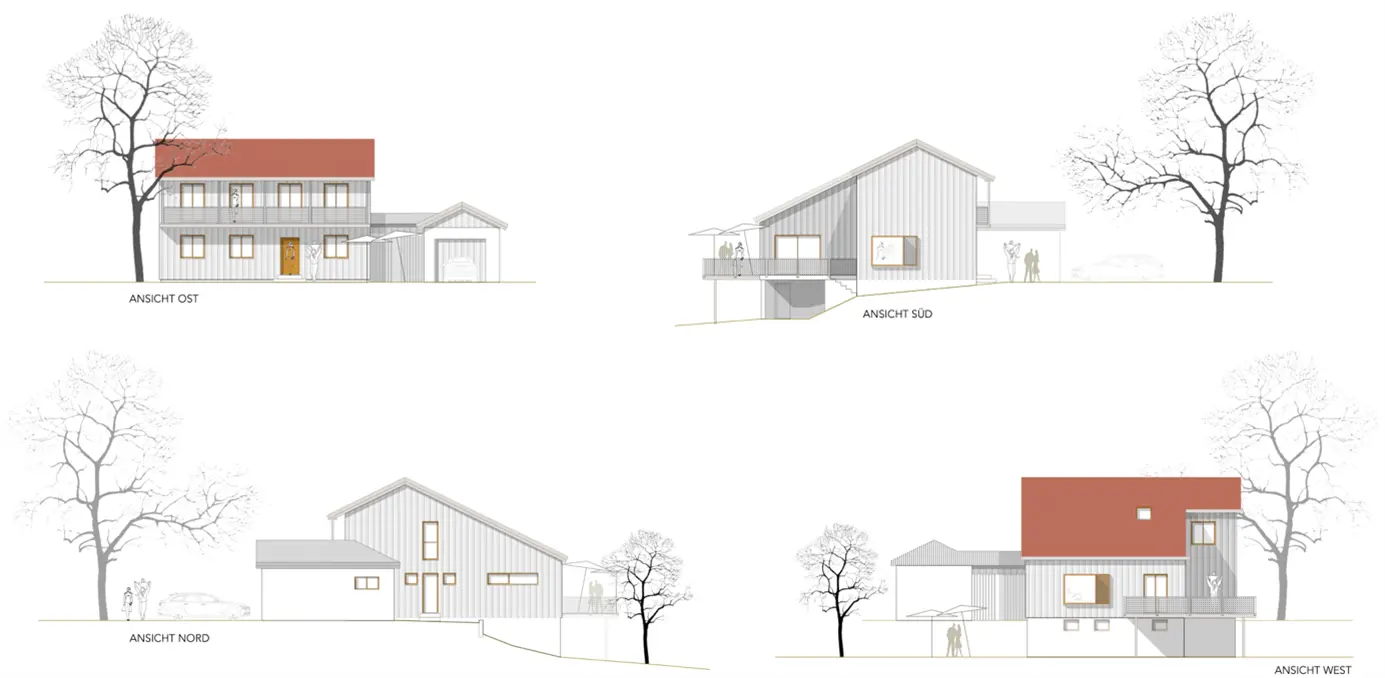 Das auf einem Hanggrundstück stehende Holzhaus aus den 60er Jahren erfährt eine fast vollständige Entkernung und Neuordnung der Räume; das äußere Erscheinungsbild des ohnehin hochwertigen Hauses wird auch nach einer Fassadensanierung und Dämmmaßnahmen weitestgehend erhalten und somit auch seine Identifikation am Ort.