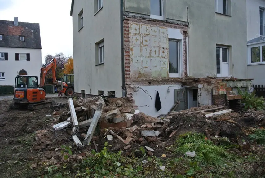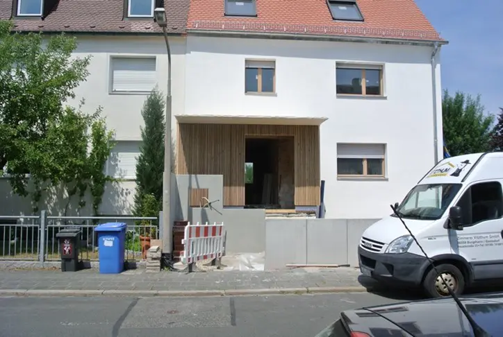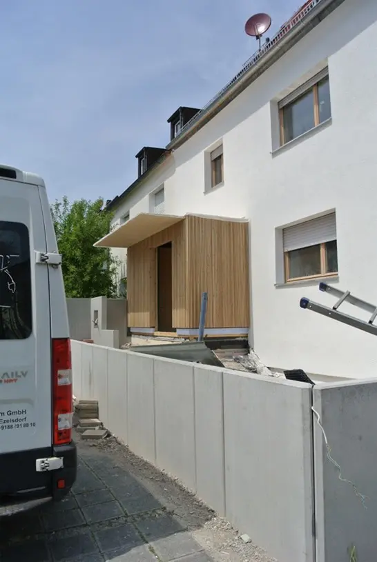 Bei der Kernsanierung einer Doppelhaushälfte aus den 1940er Jahren wurden massive Rückbaumaßnahmen wie die der Garagensituation im UG samt Herstellen einer neuen Außenwand und der eines gartenseitigen Erkers über EG und UG notwendig.
