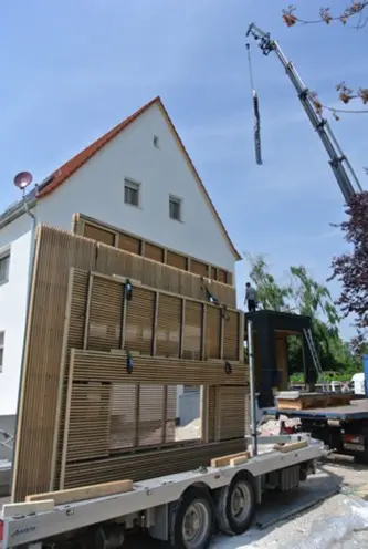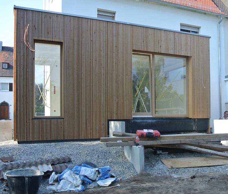 Eine neue Garagenanlage, das Errichten einer Windfanganlage und einem gartenseitigen Anbau mit großzügiger Terrassenlandschaft - jeweils mit prägnanter Lärchenleistenfassade – lassen das Haus in einem modernen, harmonisches Gesamtensemble erstrahlen.