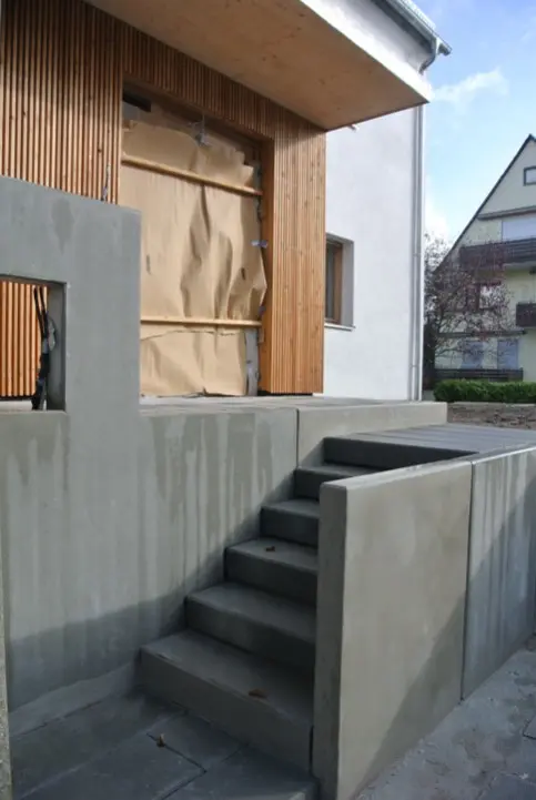 Die Hauseingangssituation mit einem Höhenunterschied von über 1m zwischen dem Straßen– und dem Erdgeschossniveau wurde durch eine Grundstückseinfriedung aus L-Winkeln hochgesetzt und mit einer eingefasster Zugangstreppe grundlegend verändert.