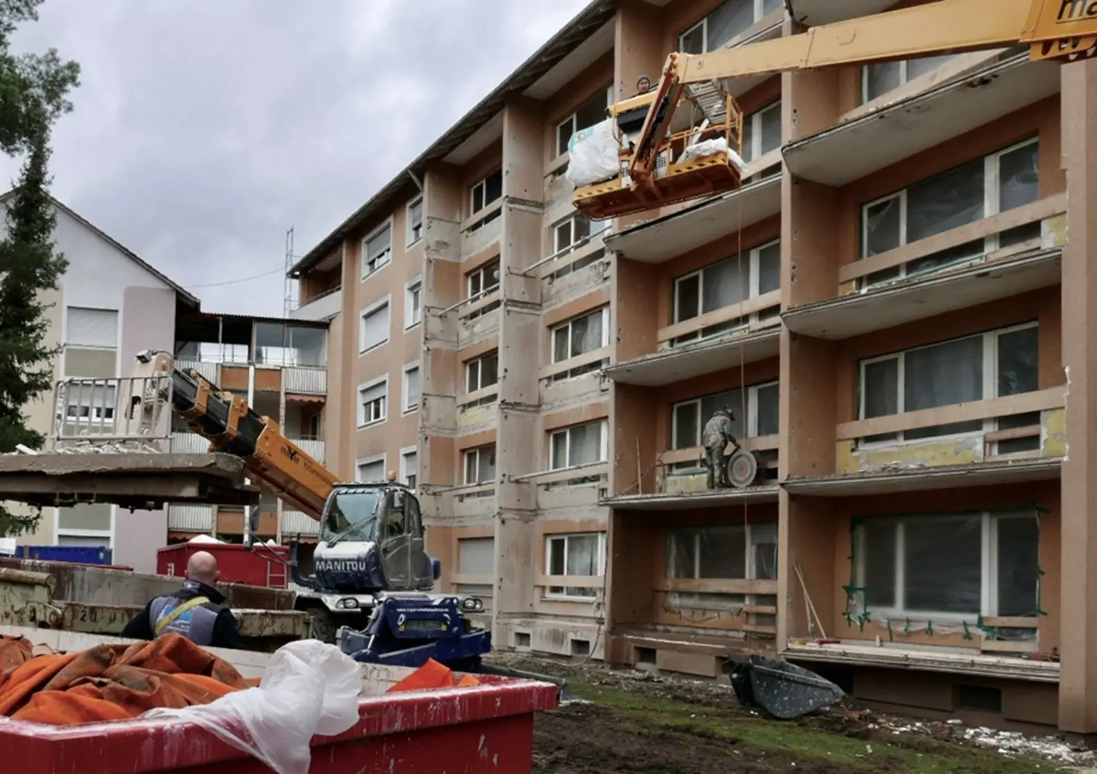 An insgesamt 16 Mehrfamilienhäusern im Süden Erlangens werden 123 marode Stahlbetonbalkonplatten mit Betonschneidgeräten vom Hubsteiger aus entfernt; nach umfangreichen Fassadensanierungsmaßnahmen werden neue Balkonanlagen vorgestellt.