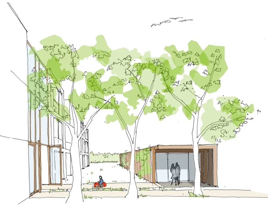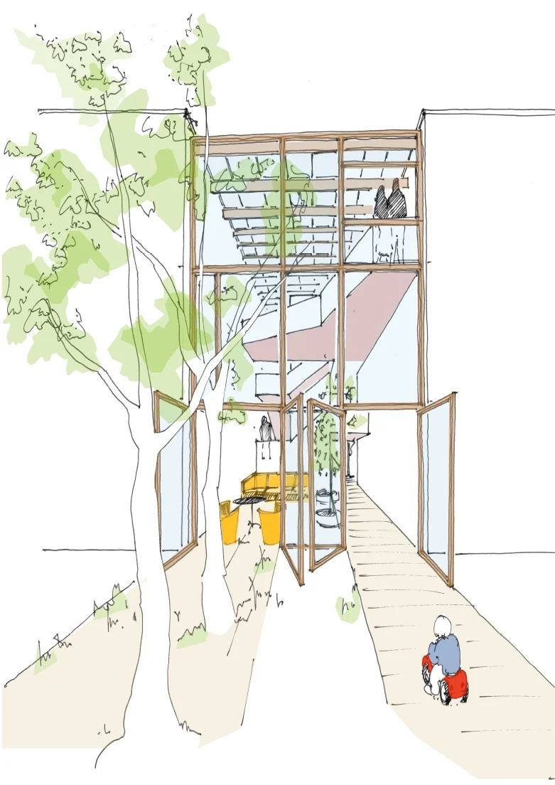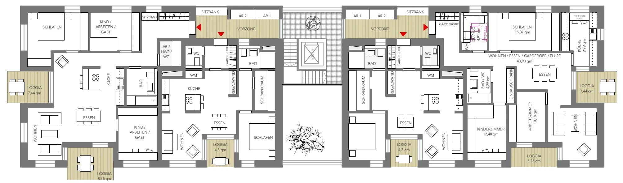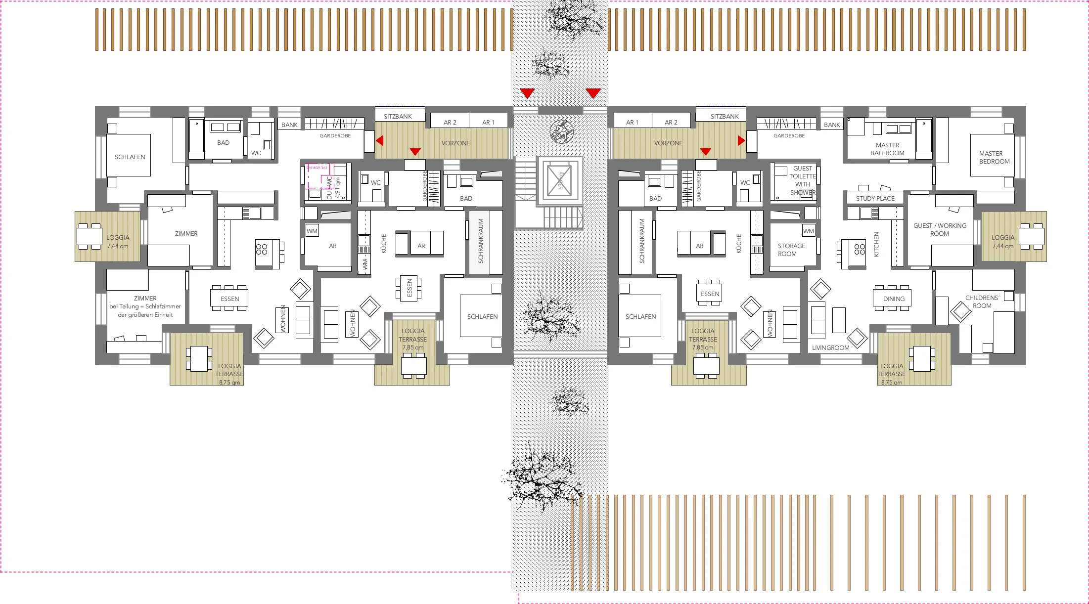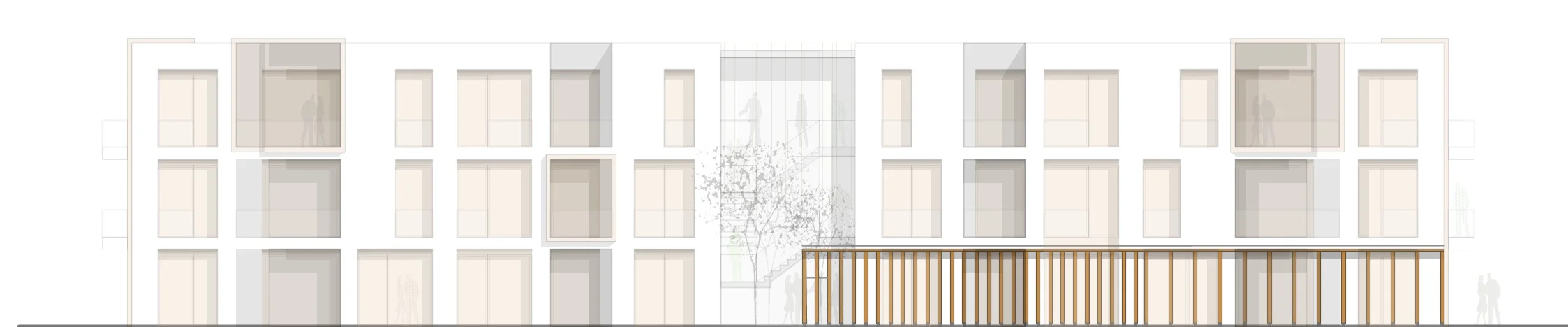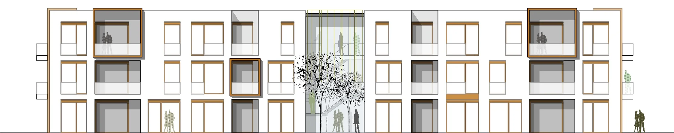 Der Baukörper wird untergliedert von einer zentral angeordneten Zone, welche Eingang, Erschließung und Raum für gemeinschaftliche Aktivitäten und Treffen außerhalb der eigenen vier Wände ermöglicht.