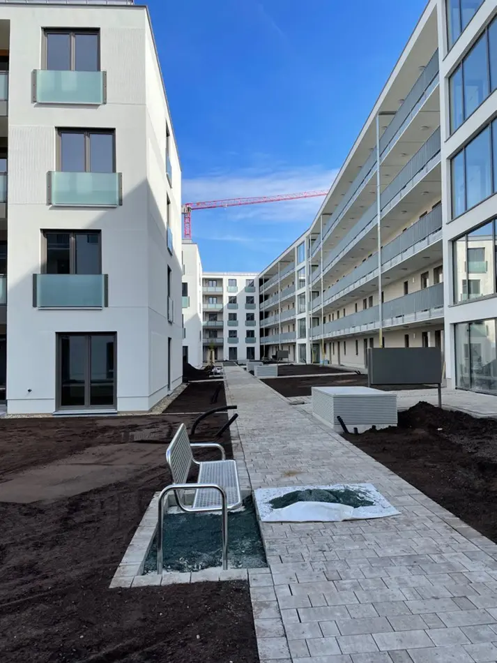 Die Außenanlagenplanung verfügt über eine umfangreiche Freiflächengestaltung zu großen Teilen auf dem Retentionsdach der Tiefgarage unter Anderem mit Flächen für urban gardening.